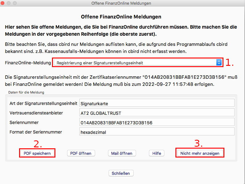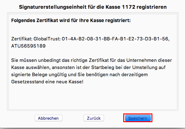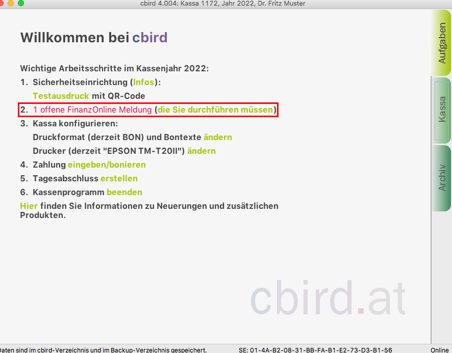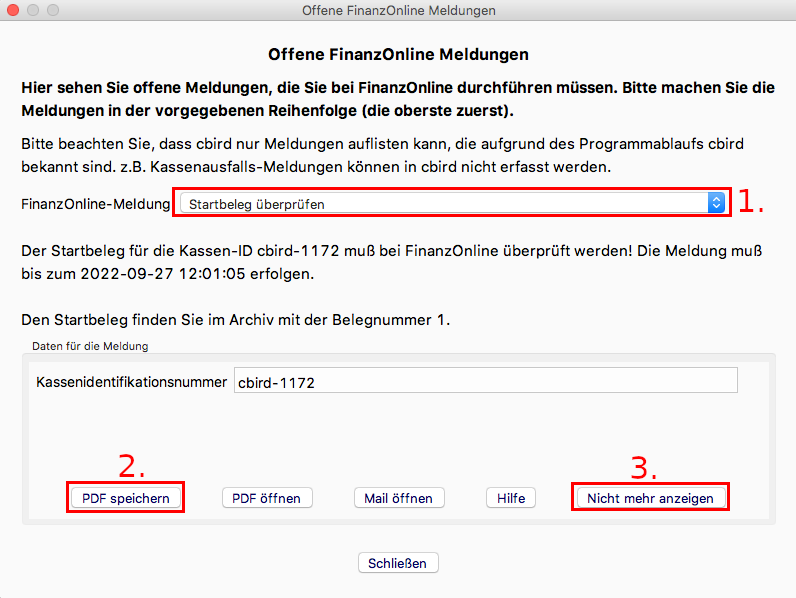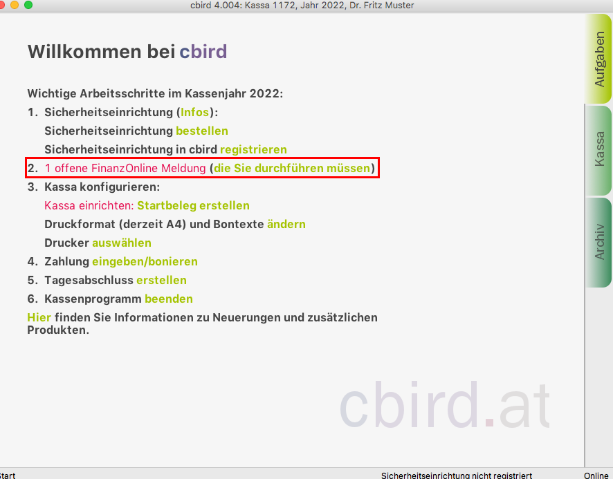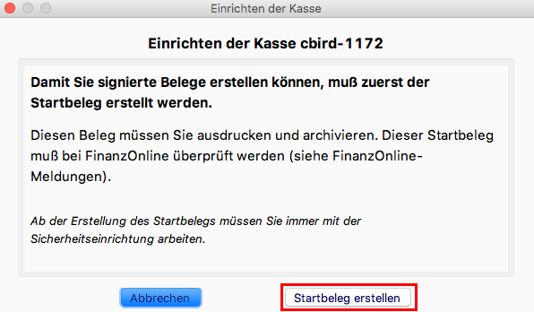 Achtung: Der Startbeleg darf erst dann erstellt werden, wenn die Registrierkasse und die Sicherheitseinrichtung erfolgreich in FinanzOnline angemeldet wurden.