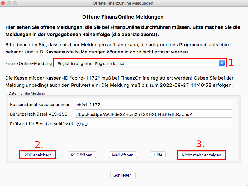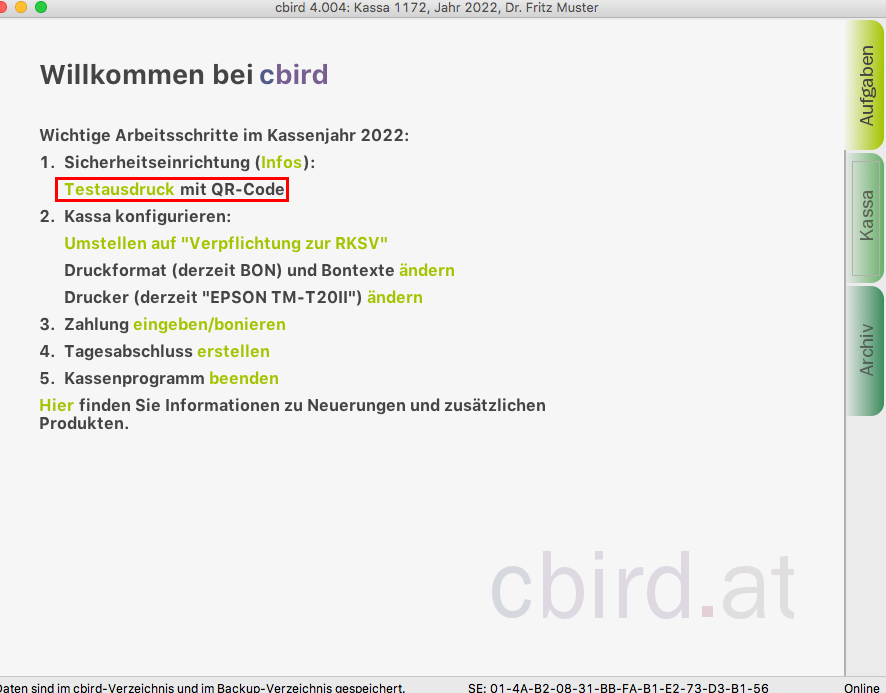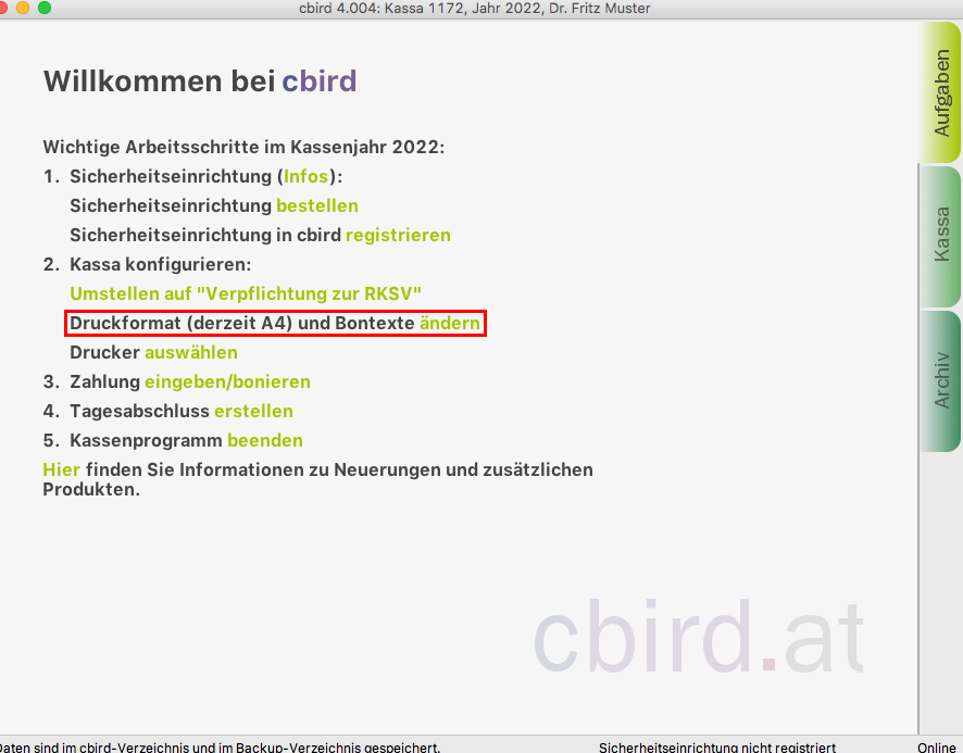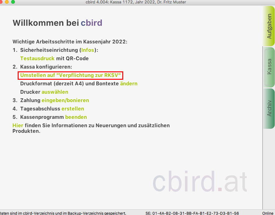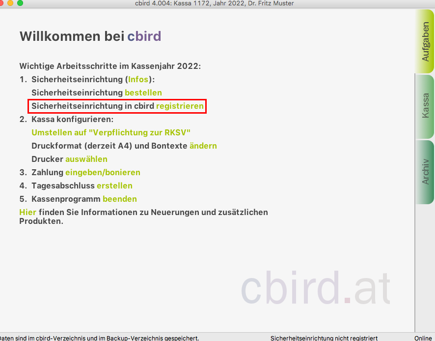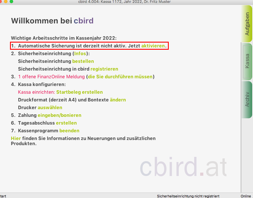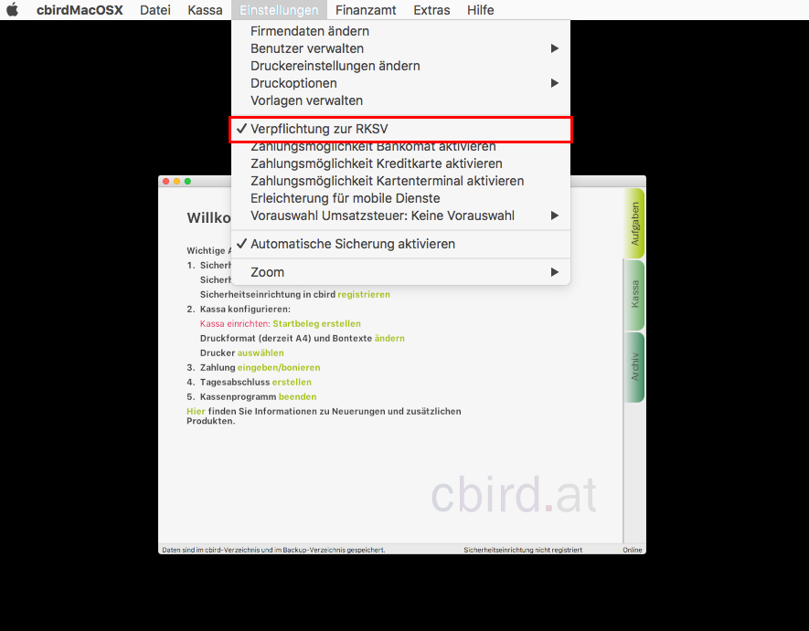 Sobald Sie die "automatischen Sicherung" aktiviert haben, erfüllt cbird die Anforderung auf diesem Computer für die Doppelte Sicherung der Registrierkassenverordnung.