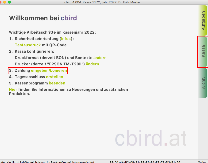 Im cbird Aufgabenbereich klicken Sie auf "eingeben/bonieren" oder klicken Sie auf den Reiter "Kassa".