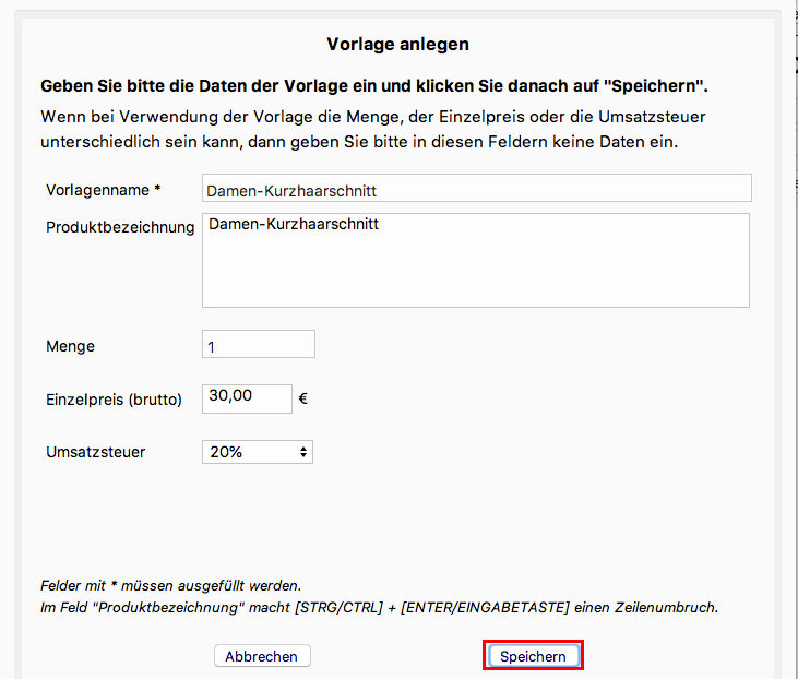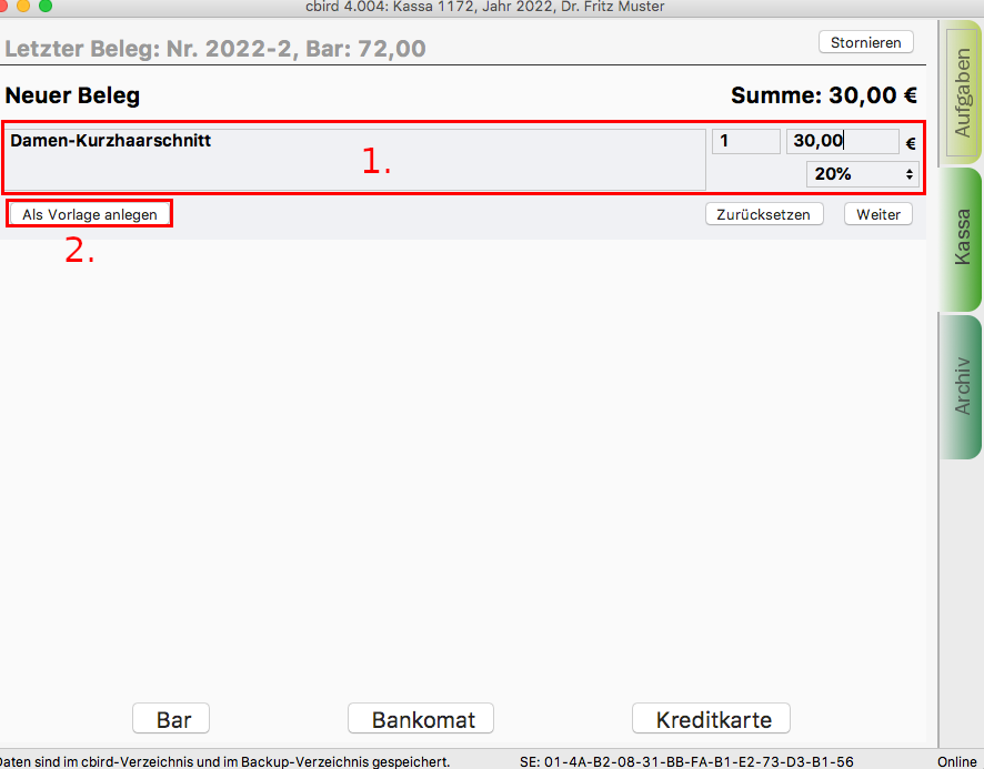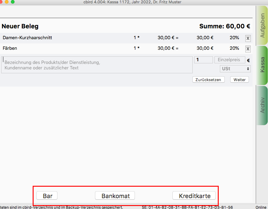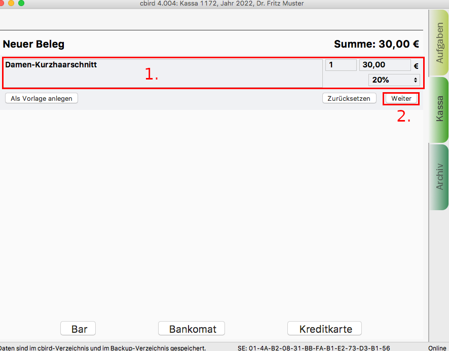 1. Im Kassenbereich geben Sie die Produkt/Dienstleistungsbeschreibeung, Menge, Preis und Umsatzsteuer ein.