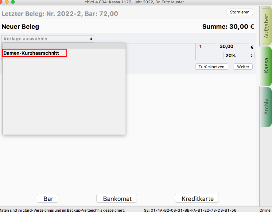 Im Kassenbereich können Sie nun unter "Vorlage auswählen" aus der Liste eine Vorlage wählen und zum Beleg hizufügen.
