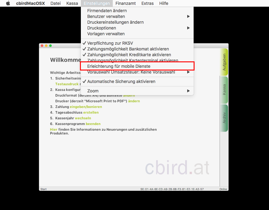 Klicken Sie im cbird Menü auf "Einstellungen" und aktivieren Sie die Option "Erleichterung für mobile Dienste".