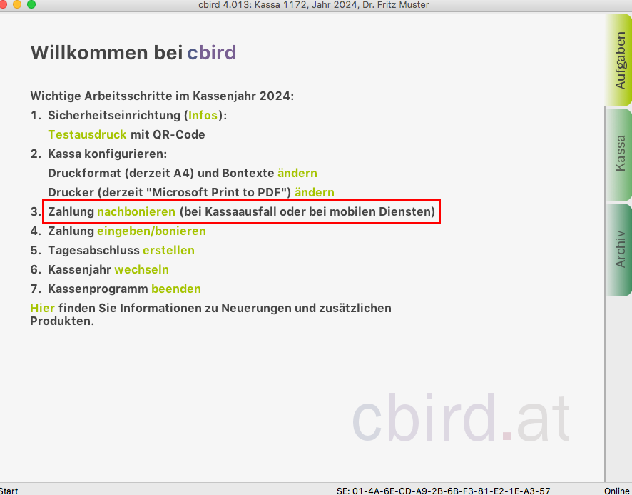 Klicken Sie im cbird Aufgabenbereich bei dem Punkt "Zahlung nachbonieren" auf "nachbonieren" oder im Menü unter "Kassa" die Option "Nachbonieren bei Kassaausfall oder bei mobilen Diensten".
