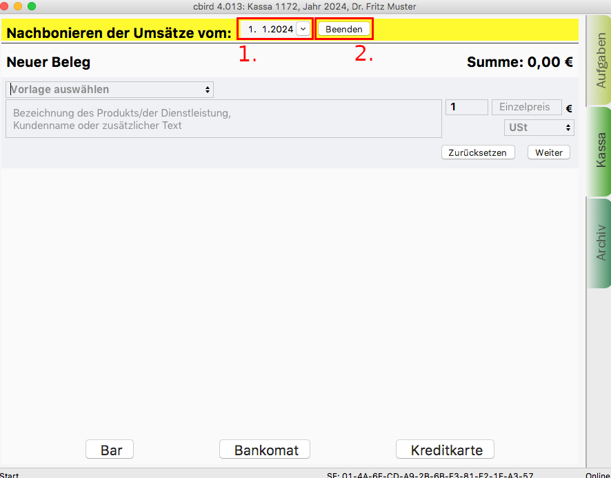 1. Im Kassenbereich wählen Sie ein Datum aus und erstellen einen Beleg. Es kann nur ein Datum zwischen dem letzten Belegdatum und dem aktuellen Tagesdatum ausgewählt werden