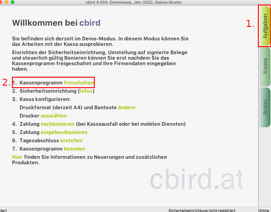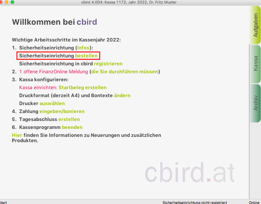 Im cbird Aufgabenbereich unter dem Punkt "Sicherheitseinrichtung" klicken Sie auf "registrieren".
