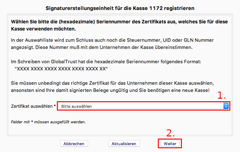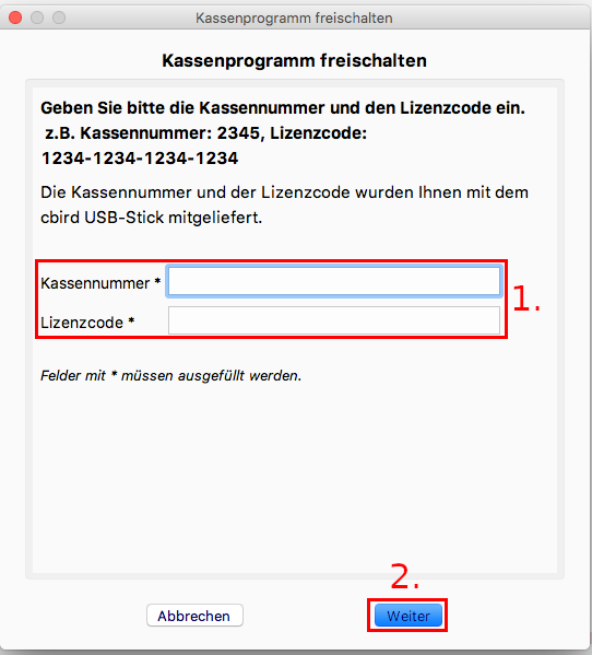 1. Geben Sie die Kassennummer und den Lizenzcode ein. Beide Nummern finden Sie im Rubbelfeld auf der Rückseite der Verpackung Ihres cbird USB-Sticks. Bewahren Sie diese gut auf!