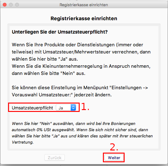 1. Falls Sie der Umsatzsteuerpflicht unterliegen, dann wählen Sie "Ja" aus. Andernfalls wählen Sie "Nein" aus.