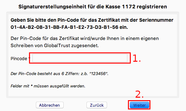 1. Geben Sie den Pincode ein (nur bei GlobalTrust Zertfikaten).