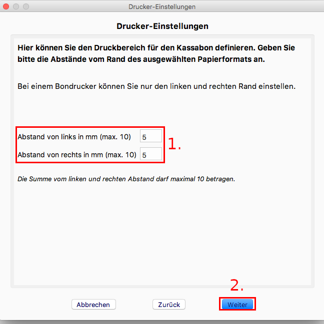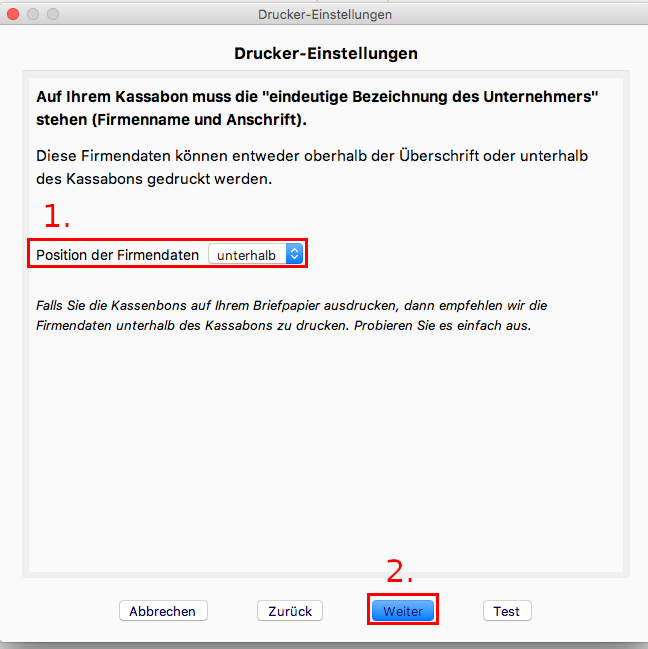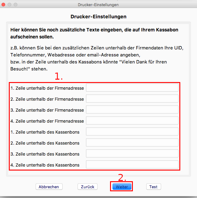 1. Optional können Sie hier zusätzliche Texte, die auf dem Kassabon erscheinen, eingeben.