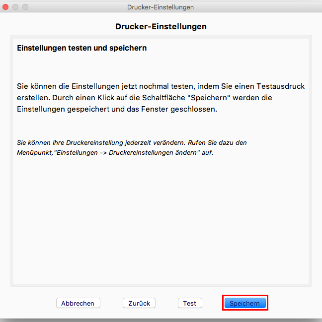 Im cbird Aufgabenbereich klicken Sie auf "Testaudruck", um zu überprüfen ob der Drucker und die Sicherheitseinrichtung funktionieren.