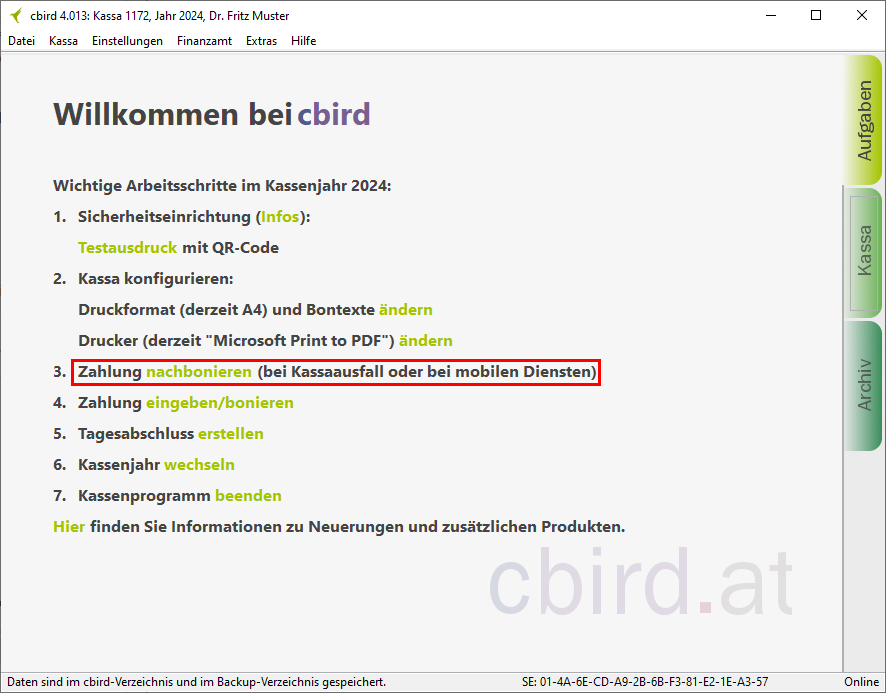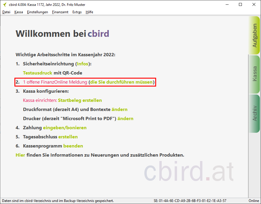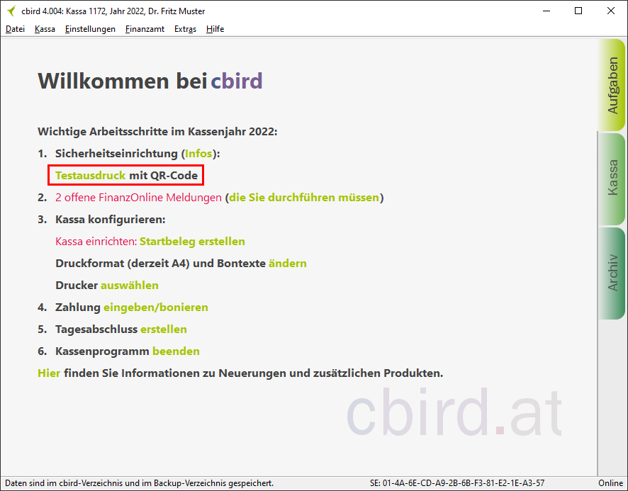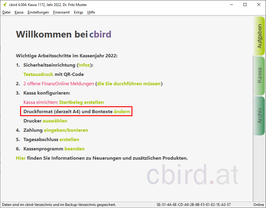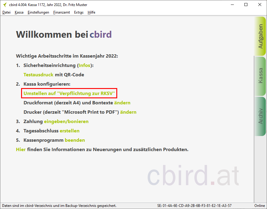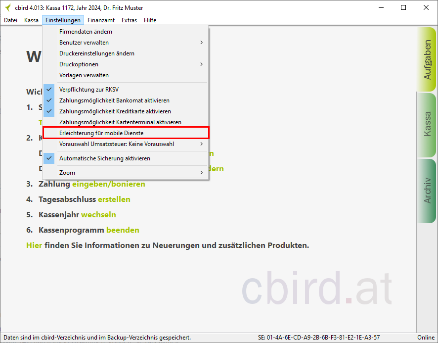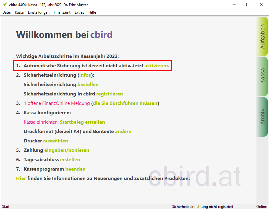Sobald Sie die "automatischen Sicherung" aktiviert haben, erfüllt cbird die Anforderung auf diesem Computer für die Doppelte Sicherung der Registrierkassenverordnung.