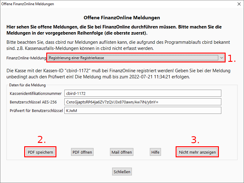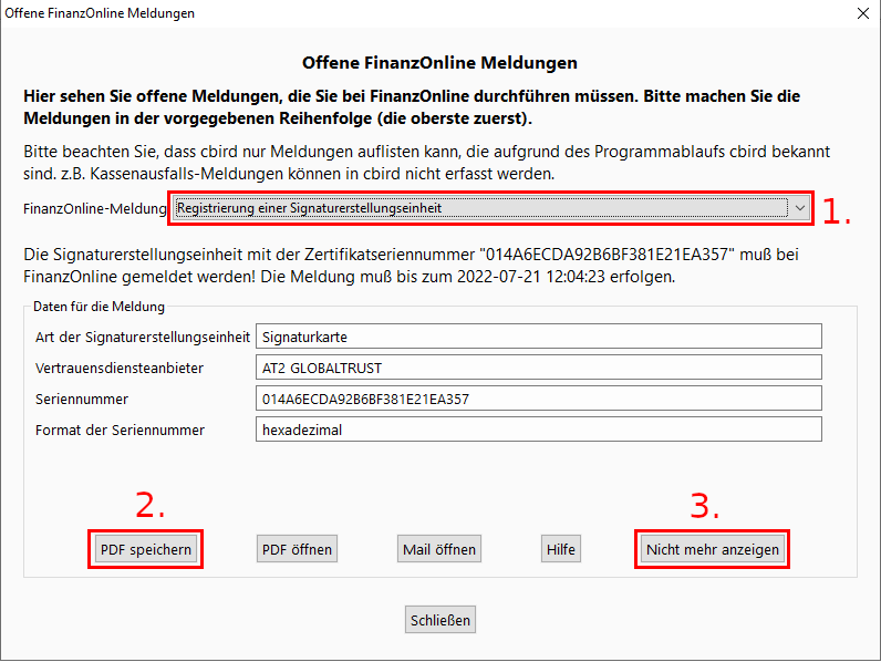 3. Erst wenn die Meldung in FinanzOnline eingetragen ist, klicken Sie auf "Nicht mehr anzeigen" bzw. "erledigt"