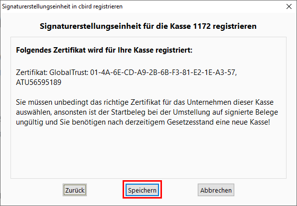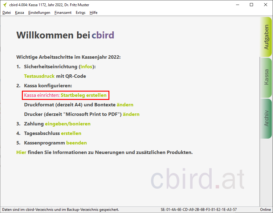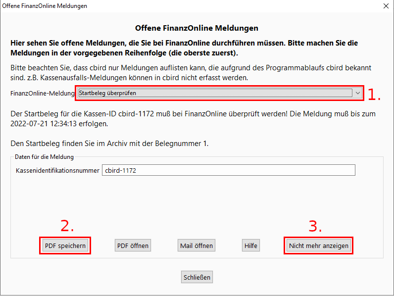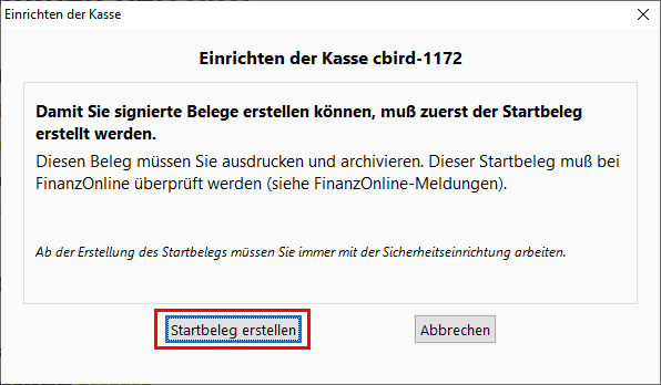 Achtung: Der Startbeleg darf erst dann erstellt werden, wenn die Registrierkasse und die Sicherheitseinrichtung erfolgreich in FinanzOnline angemeldet wurden.