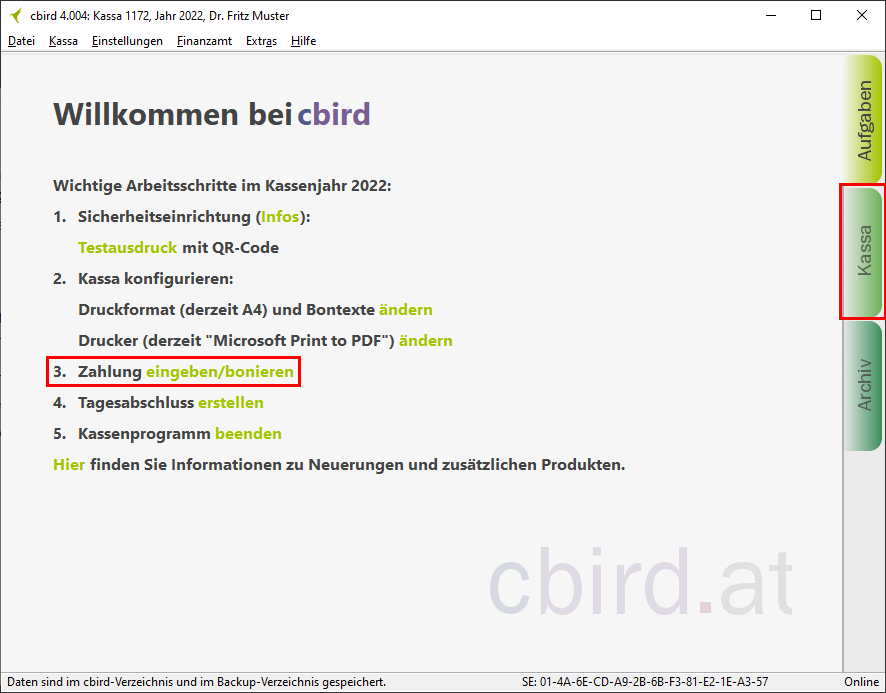 Im cbird Aufgabenbereich klicken Sie auf "eingeben/bonieren" oder klicken Sie auf den Reiter "Kassa".