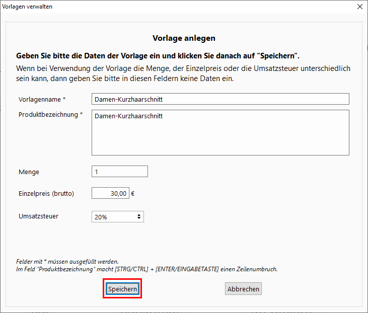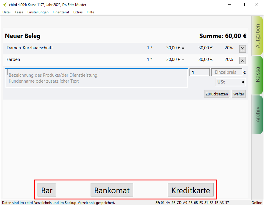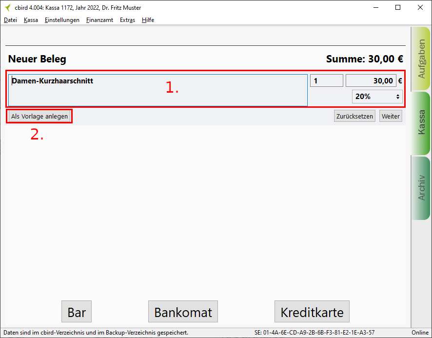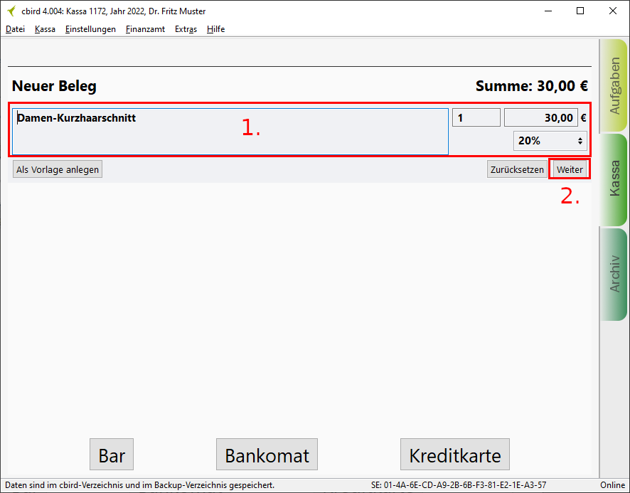 1. Im Kassenbereich geben Sie die Produkt/Dienstleistungsbeschreibeung, Menge, Preis und Umsatzsteuer ein.