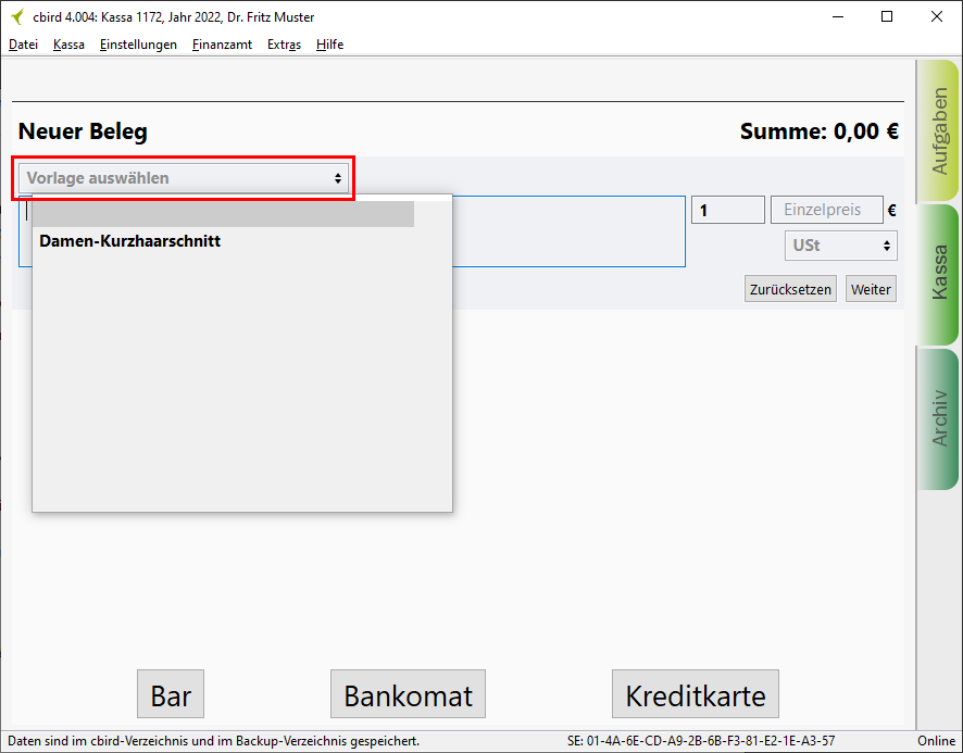 Im Kassenbereich können Sie nun unter "Vorlage auswählen" aus der Liste eine Vorlage wählen und zum Beleg hizufügen.