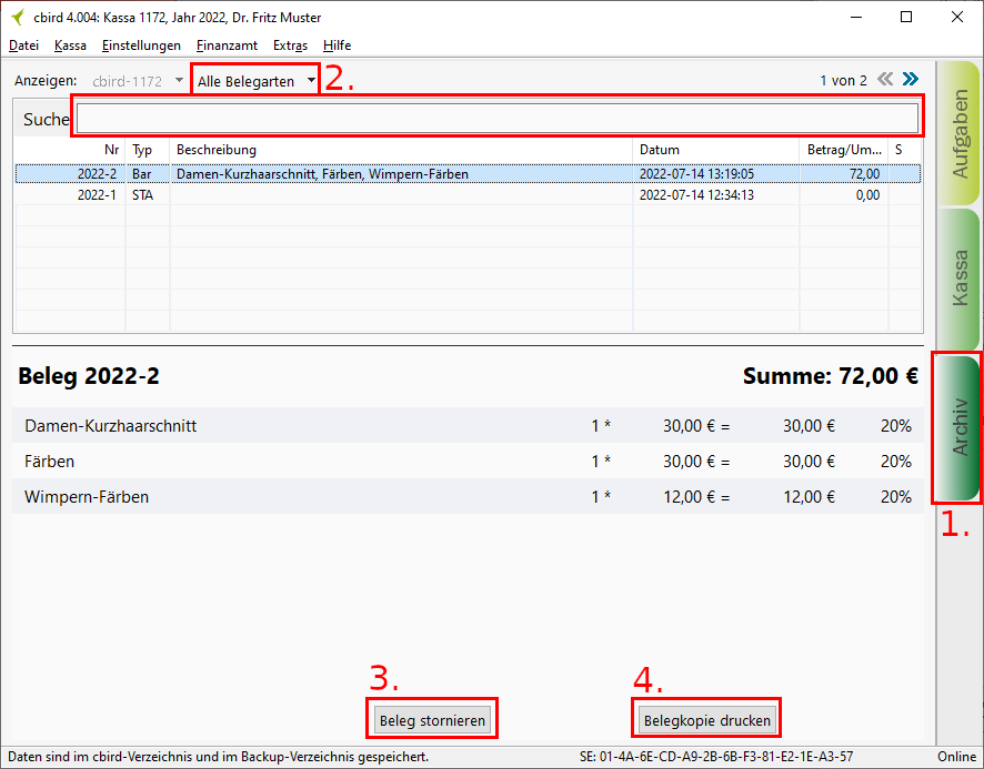 3. Stornieren eines Belegs: Wählen Sie in der Liste einen Beleg aus und klicken auf "Beleg stornieren".