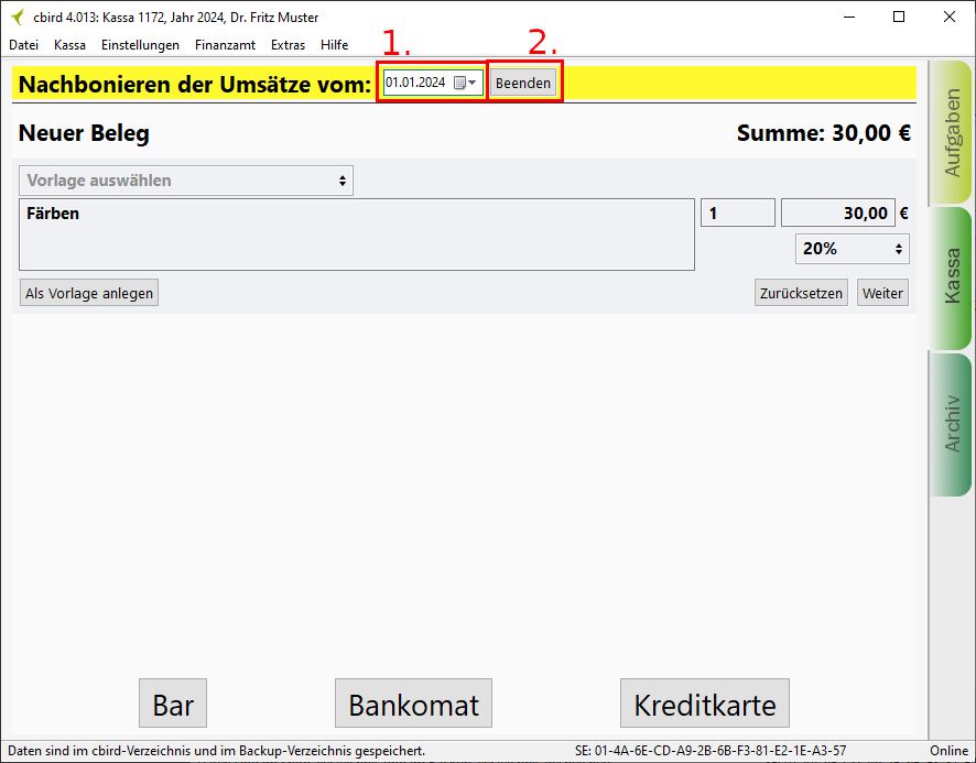 1. Im Kassenbereich wählen Sie ein Datum aus und erstellen einen Beleg. Es kann nur ein Datum zwischen dem letzten Belegdatum und dem aktuellen Tagesdatum ausgewählt werden