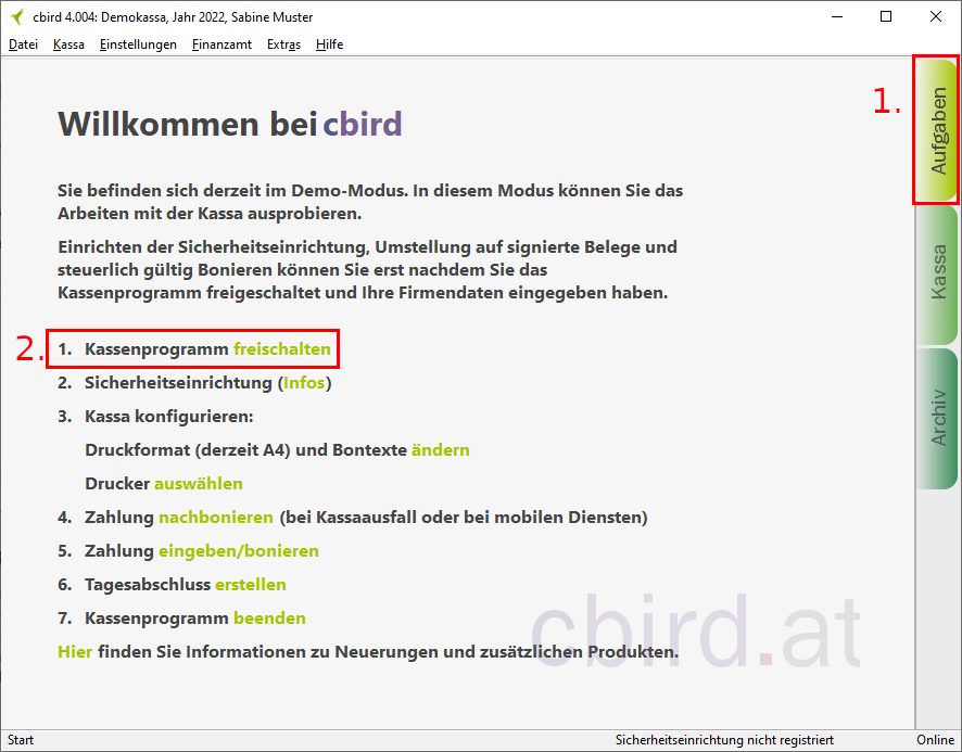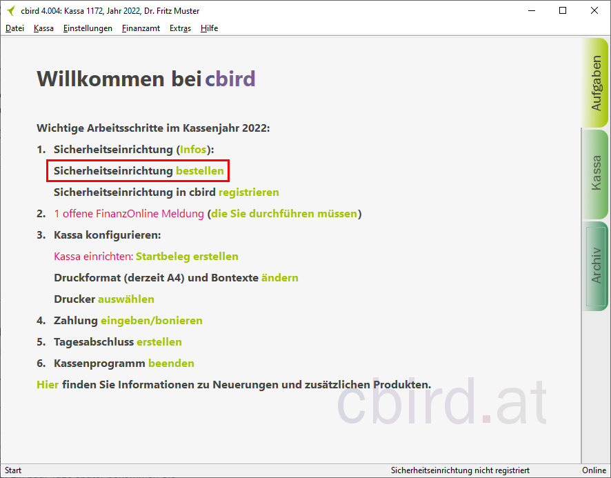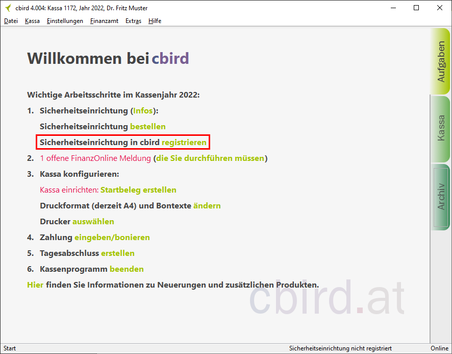 Im cbird Aufgabenbereich unter dem Punkt "Sicherheitseinrichtung" klicken Sie auf "registrieren".