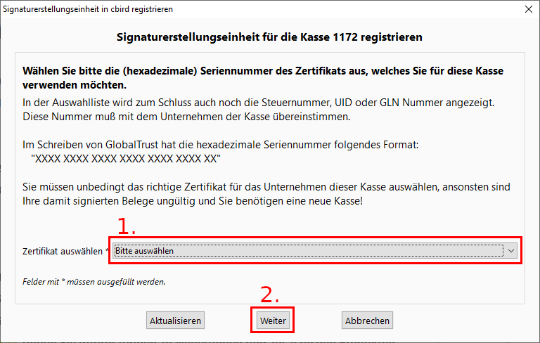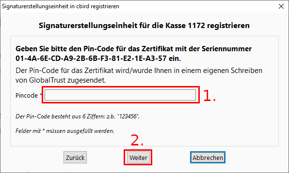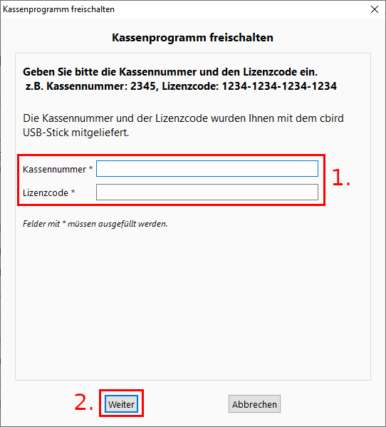 1. Geben Sie die Kassennummer und den Lizenzcode ein. Beide Nummern finden Sie im Rubbelfeld auf der Rückseite der Verpackung Ihres cbird USB-Sticks. Bewahren Sie diese gut auf!