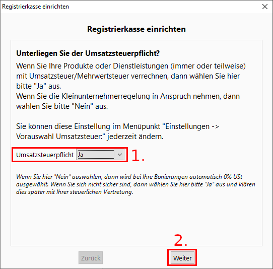 1. Falls Sie der Umsatzsteuerpflicht unterliegen, dann wählen Sie "Ja" aus. Andernfalls wählen Sie "Nein" aus.