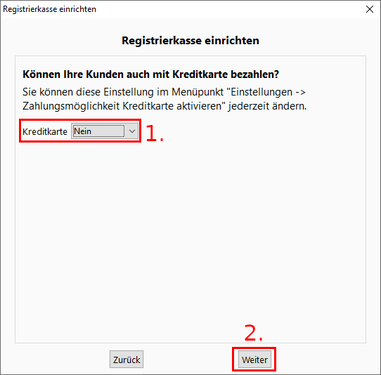 1. Falls Kreditkartenzahlungen möglich sind, dann wählen Sie "Ja" aus. Andernfalls wählen Sie "Nein" aus.