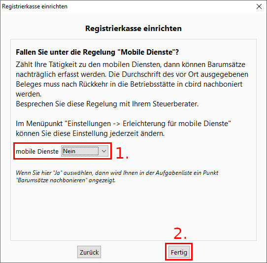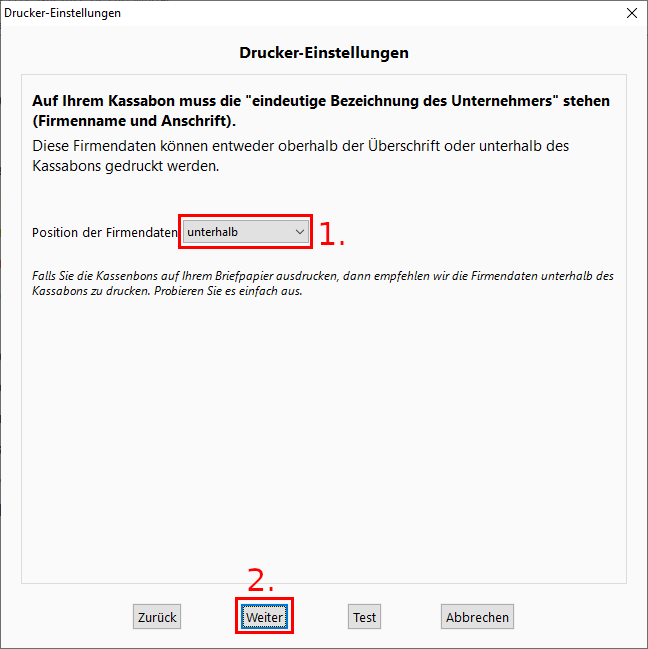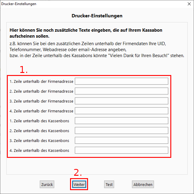 1. Optional können Sie hier zusätzliche Texte, die auf dem Kassabon erscheinen, eingeben.