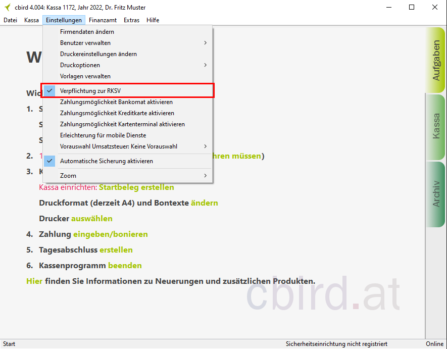 Hierzu deaktivieren Sie im cbird Menü "Einstellungen" die Option "Verpflichtung zur RKSV".